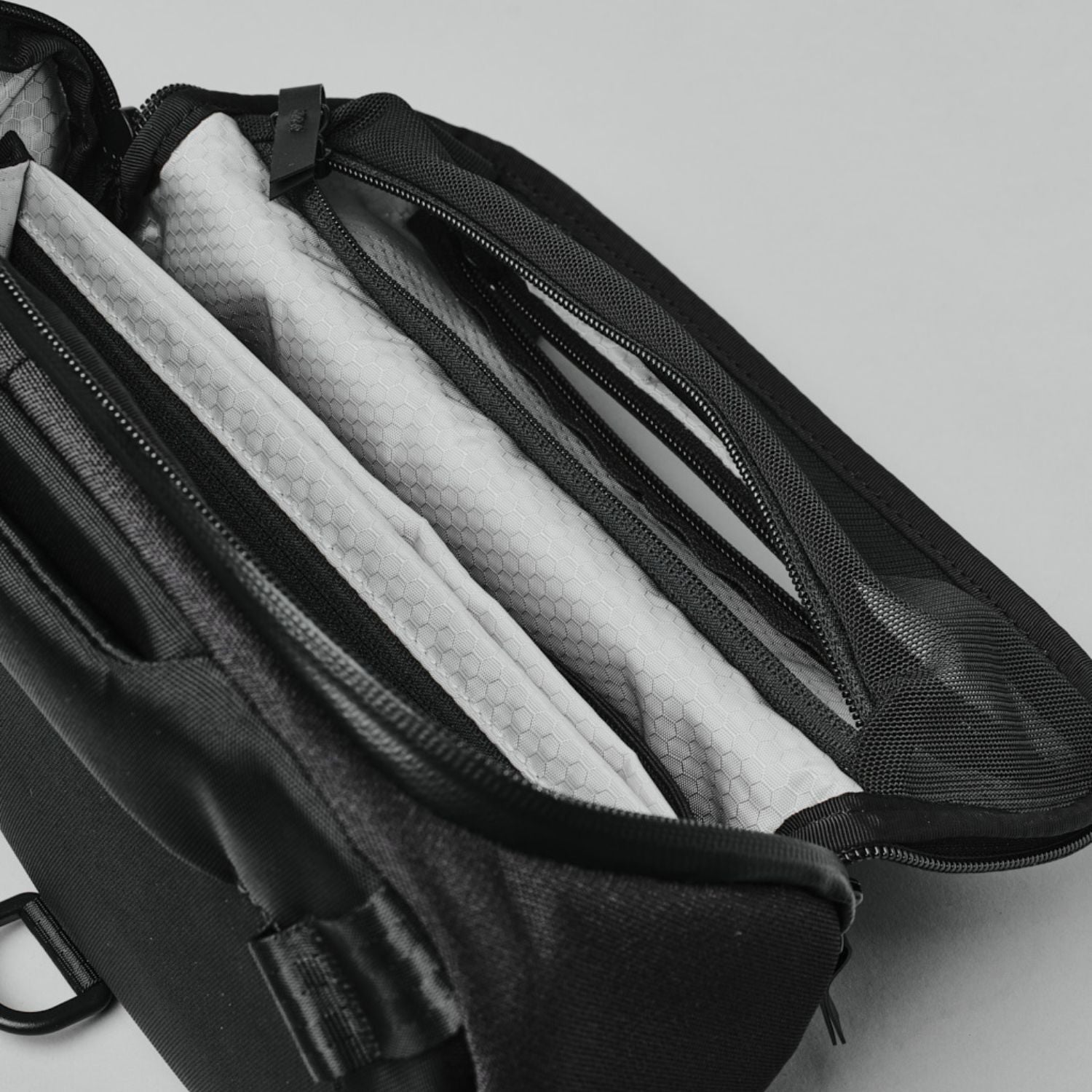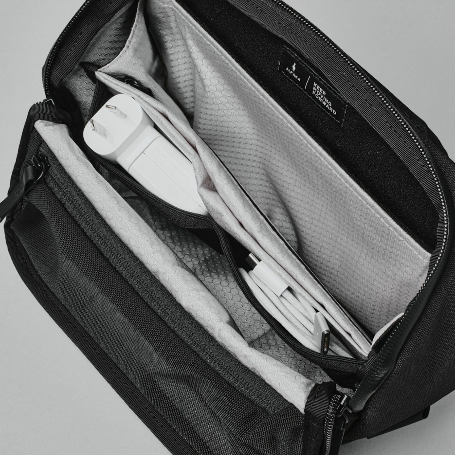 Lynlåsen til hovedrummet kan åbnes fra begge sider og åbner sig helt op i den side, man åbner fra, hvilket giver helt uhindret adgang til indholdet. Kompressionsstropperne i siderne sikrer, at tasken holder en flad profil og udvider sig i takt med indholdet. En anden praktisk detalje er, at skulderstroppen kan afmonteres, hvilket især er en fordel, hvis man ønsker at bruge tasken som “camera cube” i en større taske.
